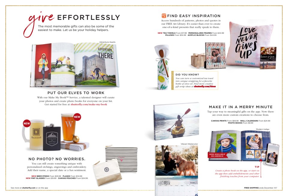 Collaborated with creative team to create Shutterfly’s “Make Holiday Magic” campaign, then concepted and wrote the gift guide portion of the catalog (including bookmap, product selections, and all copy).