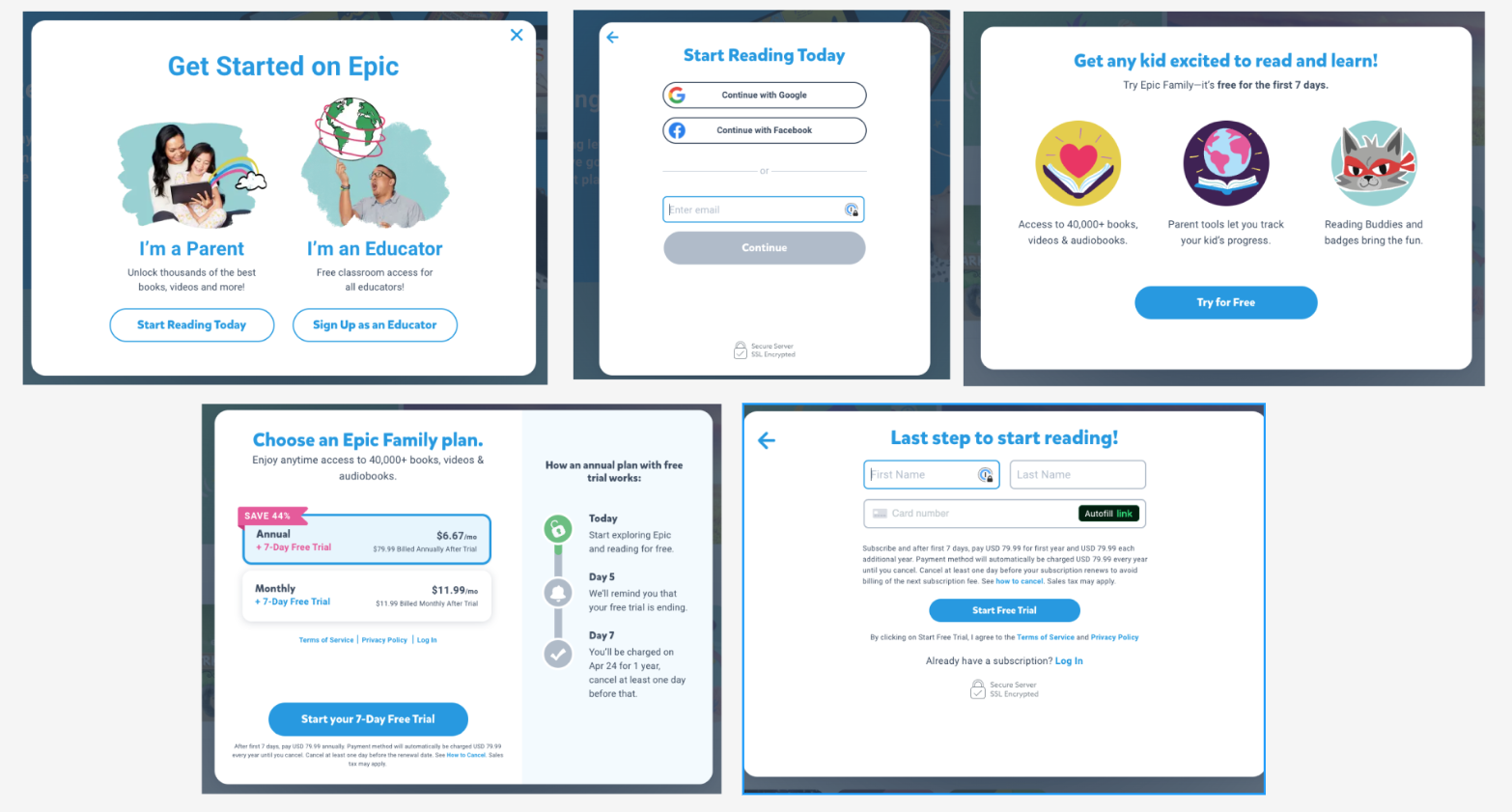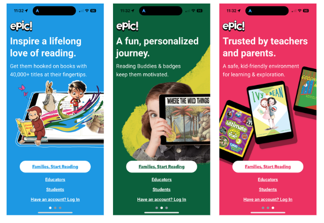 When new users download the Epic app, these screens share the value props to entice them to create an account.