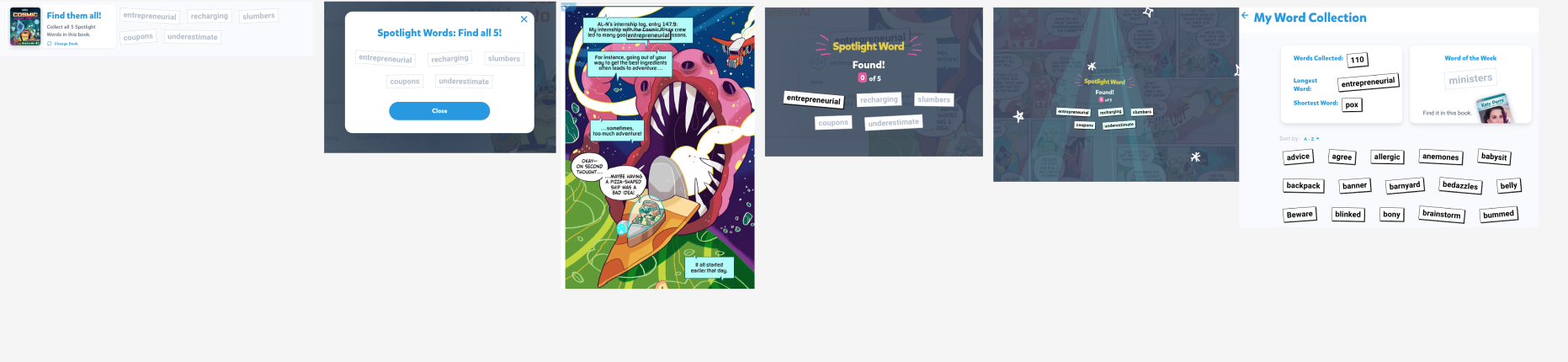 The flow for our kid-facing Spotlight Words feature in the app.