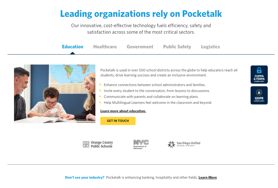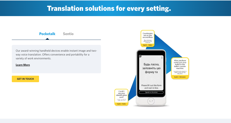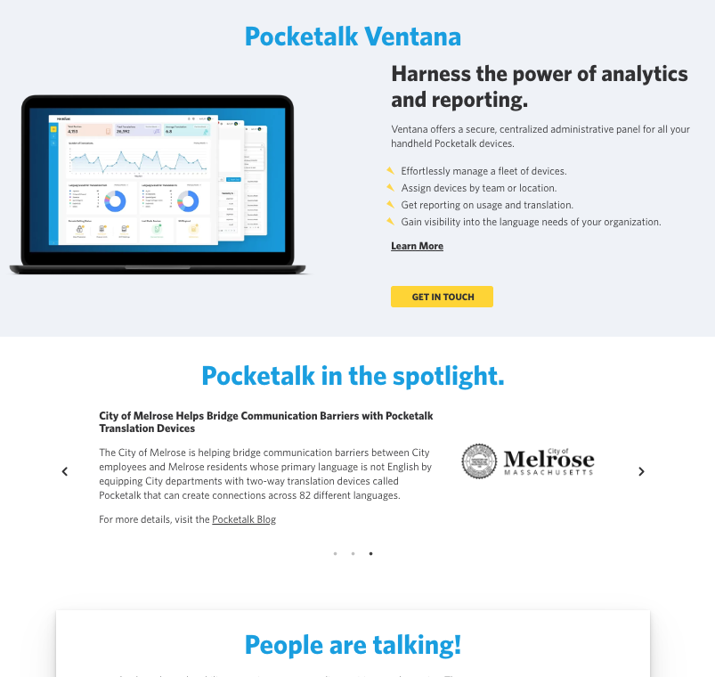 Pocketalk makes translation devices and software for organizations and individuals. They needed a rebrand that positioned them more in the B2B space. I teamed up with an art director to create a new brand guide, redesign their homepage and update all copy. As part of that project, we helped them develop their mission and vision statements, brand look and feel, and tagline (“Welcome to the conversation”).